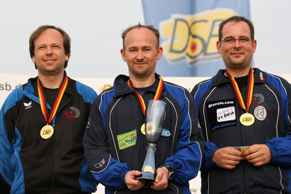 Die üblichen Verdächtigen (v. l. n. r.): Bernd Schott, Joachim Vogl und Norbert Ettner werden auch 2009 für den "Bund" München Deutscher Meister mit der 10-Meter-Armbrust. Bild: Mike Hecker