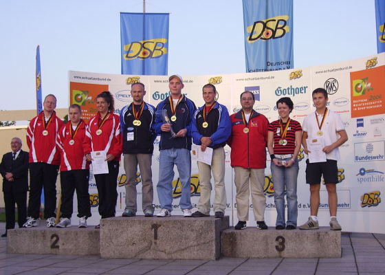 Nicht nur in der Einzelwertung ganz oben: Joachim Vogl gewinnt auch zusammen mit seinen Mannschaftskollegen Sebastian Moser und Thomas Scherke für die Kgl. priv. FSG "Der Bund" München die Deutsche Meisterschaft Armbrust 10 m 2006. Bild: privat
