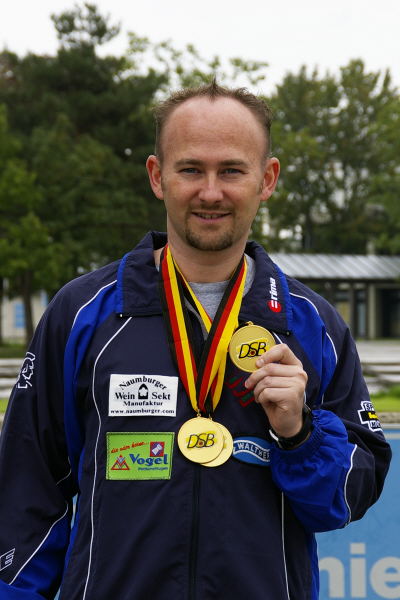 ![]() Joachim Vogl holt bei der Deutschen Meisterschaft 2007 in München/ Hochbrück drei Goldmedaillen: Armbrust 10 m Einzel (zum 4. Mal in Folge), Armbrust 10 m Mannschaft (mit neuem Deutschen Rekord) und Gewehrschießen 100 m Einzel. Bild: Peggy Vogl |
