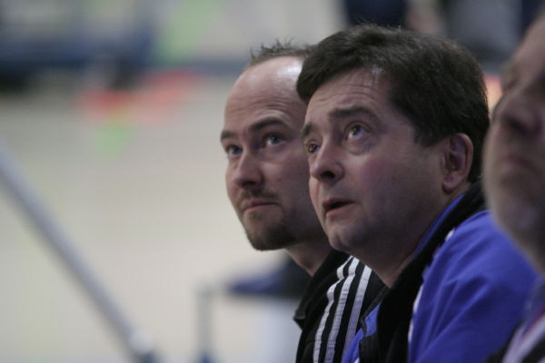 Steht die Anspannung ins Gesicht geschrieben: Joachim Vogl (links hinten, unmittelbar nach seinem Wettkampf) und Mentor Hans Riederer am 4. November 2006 beim Bundesliga-Wettkampf in Hebertshausen gegen den Post SV Plattling. Bild: Christian Heinrich |